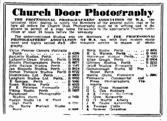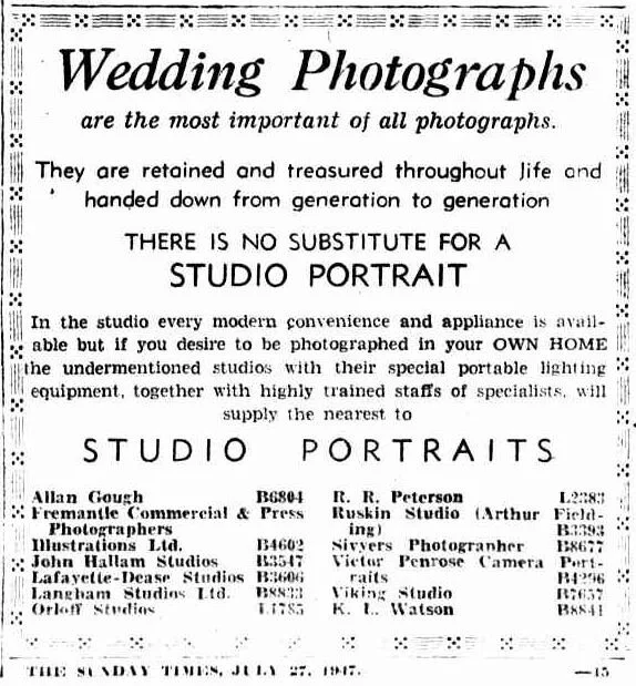 1947 Peterson is listed as a specialist wedding portrait photographer (reference) and as a member of the Professional Photographers Association of WA (reference) He also bought a new car- a Hudson sedan (reference)