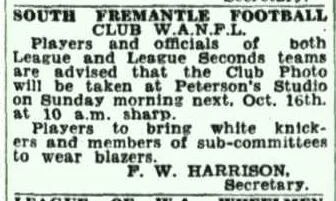 1949 SOUTH FREMANTLE FOOTBALL CLUB W.A.N.F.L.Players and officials of both League and League Seconds teams are advised that the Club Photo will be taken at Peterson's Studio on Sunday morning next Oct 16th at 10 am sharp. Players to bring white knickers and members of sub-committees to wear blazers. F. W. HARRISON (reference)