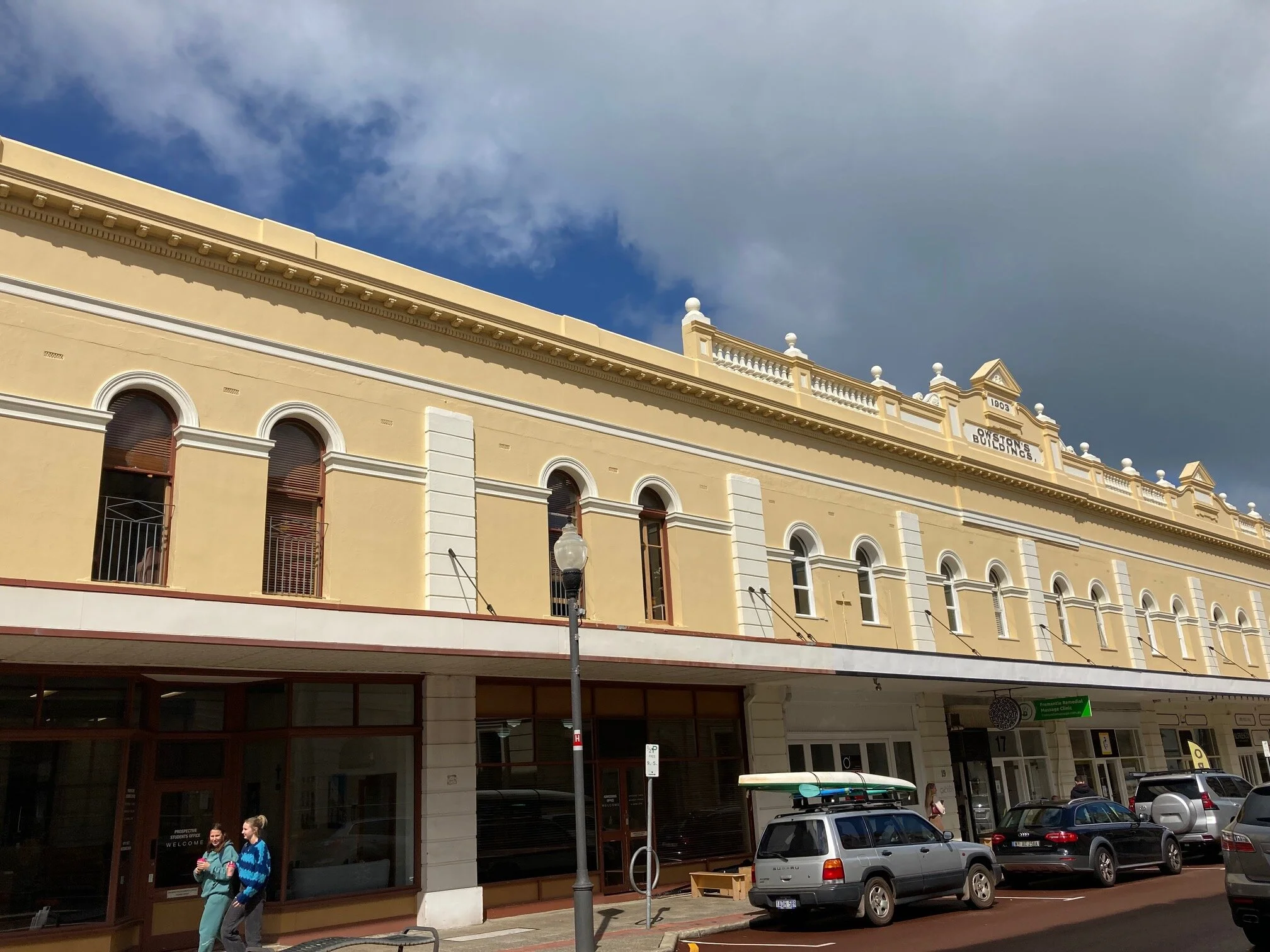 Architecture: Two storey rendered building, separated on the façade by pilasters with ashlar effect, separating the building into eight sections with zero setback from the pavement. It has a roof parapet above the moulded cornice with low pier balustrading and a centre pediment with the 'Owston's Buildings' name and date- 1903.